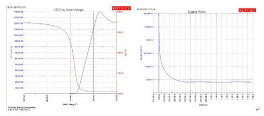 圖5.利用吉時利4200-SCS進行參數提取的實例表現了半導體的摻雜特征(左邊的藍線),它與1/C2與Vg的關系呈倒數關系(紅線)。右圖給出了摻雜分布,即每立方厘米的載流子數與襯底深度的函數關系。