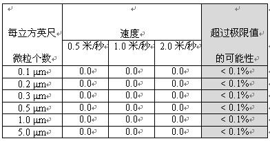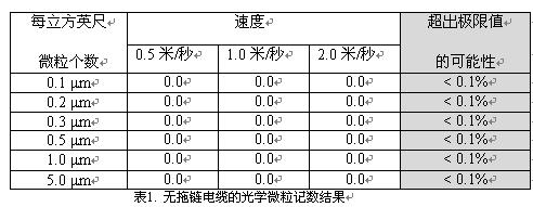光學微粒記數器記錄了無拖鏈電纜(見表1)和裝有高柔性扁平電纜的電纜拖鏈A在每個測量點產生0個微粒(見表2)。按照VDIGuideline2083和ISO14644-1標準的集塵可能性的計算方法,測定這些電纜在上述測試速度的集塵可能性低于0.1%。
