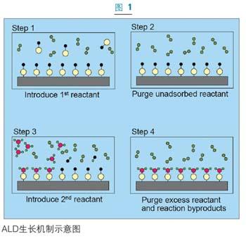 ALD的基本步驟如圖一所示。這種淀積過(guò)程是在經(jīng)過(guò)活性表面處理的襯底上進(jìn)行的。首先將第一種反應(yīng)物引入反應(yīng)室使之發(fā)生化學(xué)吸附,直至襯底表面達(dá)到飽和。過(guò)剩的反應(yīng)物則被從系統(tǒng)中抽出清除,然后將第二種反應(yīng)物放入反應(yīng)室,使之和襯底上被吸附的物質(zhì)發(fā)生反應(yīng)。剩余的反應(yīng)物和反應(yīng)副產(chǎn)品將再次通過(guò)泵抽或惰性氣體清除的方法清除干凈。這樣就可得到目標(biāo)化合物的單層飽和表面。這種ALD的循環(huán)可實(shí)現(xiàn)一層接一層的生長(zhǎng)從而可以實(shí)現(xiàn)對(duì)淀積厚度的精確控制。