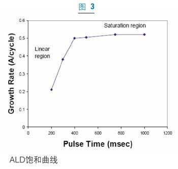 圖3中的飽和曲線說(shuō)明了ALD過(guò)程的自約束特性。生長(zhǎng)率隨脈沖時(shí)間呈線性增長(zhǎng),直到達(dá)到飽和條件。達(dá)到飽和以后,增長(zhǎng)率為常數(shù),且不再隨脈沖時(shí)間變化而變化。但是,如果同時(shí)存在一種寄生的CVD生長(zhǎng)成分或反應(yīng)物的分解的話,增長(zhǎng)率就會(huì)顯著增加。因而,飽和曲線通常用來(lái)確定ALD的純度。ALD生長(zhǎng)速率介于每循環(huán)0.3埃到1.5埃間。雖然ALD的生長(zhǎng)速率在制備很薄的膜(<200埃)時(shí)還可以接受,但在用ALD生長(zhǎng)厚膜時(shí),生長(zhǎng)周期就成為挑戰(zhàn)。