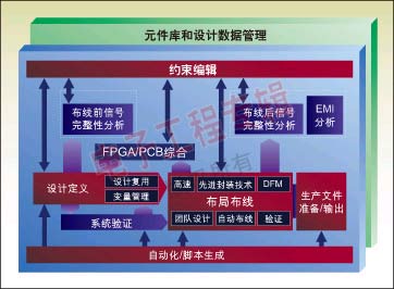 圖1表明了一個典型的由前端到后端的綜合系統設計。它始于設計定義(原理圖輸入),該設計定義與約束編輯緊密集合在一起。在約束編輯中,設計者既可定義物理約束又可定義電氣約束。電氣約束將為網絡驗證驅動仿真器進行布局前和布局后分析。仔細看看設計定義,它還與FPGA/PCB集成相鏈接。FPGA/PCB集成的目的是為了提供雙向集成、數據管理和在FPGA與PCB之間執行協同設計的能力。