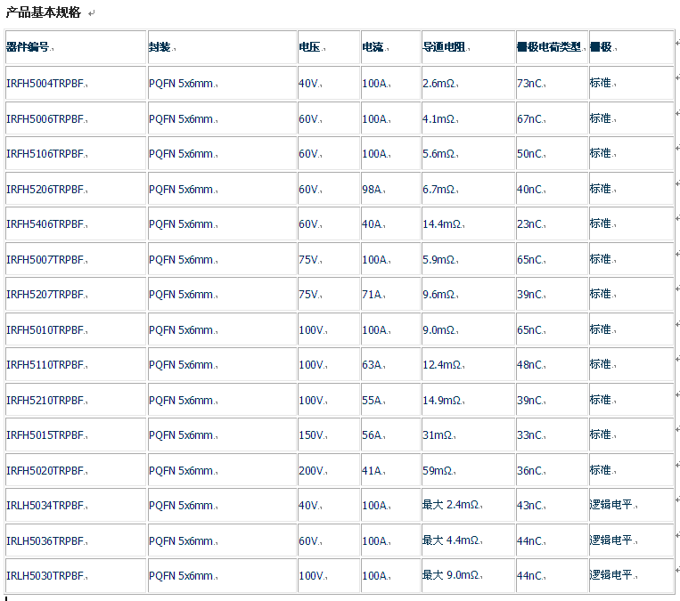 國際整流器(IR) 7月2日宣布,將拓展HEXFET功率MOSFET產(chǎn)品組合,提供完整的中壓器件系列,其中采用了5x6mm PQFN封裝及優(yōu)化銅夾和焊接芯片技術(shù)。