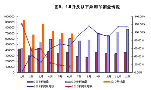 1. 1.6升及以下排量乘用車銷量增速回落明顯 上半年,1.6升及以下排量乘用車銷售462.55萬輛,占乘用車銷量的68.83%,市場占有率同比下降2個百分點;銷量同比增長44%,低于汽車銷量市場4個百分點。其中,1、2季度銷量同比增長分別為77%、19%,2季度比1季度增速回落58個百分點。