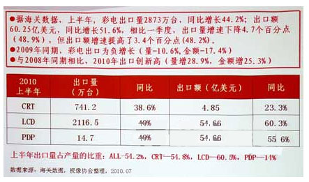 - 2010年上半年,彩電出口總量為2873萬臺,同比增長44.2%