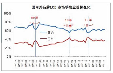 尤其在節慶期間,外資品牌大規模的降價促銷,使得國內電視品牌城市市場的規模及利潤大幅縮減。2010年五一前,外資品牌重點在32英寸的2499/2999元兩個定價點,逐步擴張城市中低端市場。從五一開始,外資品牌將策略延伸至大尺寸,40英寸平板電視價格低至4499元,將內外資品牌電視價差降至500元以內,對國產品牌產生較大沖擊。不過,在農村市場,國內電視企業面對家電下鄉政策帶來的巨大機會,可憑借一貫的本土優勢全力彌補城市市場的份額損失,從而使其與外資電視品牌市場份額比例保持在7:3(見圖3)。