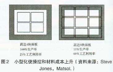 如果在一個方向持續地發生不正確的變化,在生產期間通過調整處理,可以很容易地得到糾正。但是在PCB生產過程中大多數的隨機變化是很難予以控制的。在實際生產過程中,每塊面板的尺寸可能會發生變化。當設計規定的允許誤差為100μm或者更大的時候,這可能不會是什么問題。然而,當把大量的功能放入一個很小的空間時這就意味著設計規定的允許誤差趨小。當裝配人員將PCB組件放置入較小形狀的面板上時,隨機變化現象將會大大的減少。但令人感到遺憾的是,這將涉及到大量的成本問題:為了滿足小型化面板的需要,需要更多的處置成本,材料的利用則會降為比較次要的問題(圖2)。