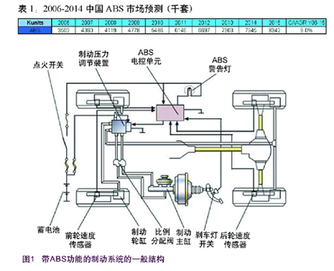 隨著經濟的不斷發展,人們對汽車的需求正日益加強,與之相應,汽車的消費群體也變得越來越成熟,主要表現在消費者除了關注汽車的外型外還越來越重視汽車的內在品質,其中,汽車的安全特性逐漸成為用戶考慮的首要選購條件。由此,作為主要的安全系統之一的汽車防抱死制動系統(ABS)正引起越來越多的關注。下表(表1)是世界著名咨詢公司StrategyAnalytics對中國ABS市場的預測,從中我們可以明顯地看出這種不斷增長的趨勢,預計在2006-2015年期間中國的ABS市場的年復合增長率將達到9.0%。