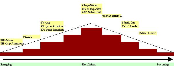 鋁電容器技術路線圖已經發展到一個節點上,在此新投資聚集在鋁固體聚合物元件,以及作為替代技術的碳和鈮介質開發上。更完善的產品,如單元安裝電容器(snap-mount)、閃光電容器(flash capacitor),和馬達啟動鋁電容器(motor start aluminum capacitors)已收到有限的投資,但繼續服務于更小的、增值的電容細分市場。老產品用于新技術研發所獲得的資金支持會更少,包括標準的徑向引線鋁電容器和軸向鋁電容器。例如,軸向引線鋁電容器,近些年來已經很少受到關注,但是他們現在作為一個傳統產品,在國防和汽車應用方面仍然保有市場。當用于上述圖表中列舉的所有主要產品的投資,在過去20年中獲得了不同程度的回報之時,市場已經轉向鋁固體聚合物電容設計,行業中的主要供應商正在調整自己的定位以把握巨大的市場機會。而且,在一些不同用途的關鍵細分市場上,如醫療電子,石油和天然氣勘探等領域,引入導電聚合物鋁技術,也會帶來增值和在特定應用市場的機會。