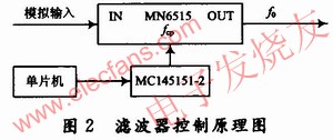 模擬器件的發展與集成為小型化提供了充分的條件,像松下公司的MN6515,僅為8腳,其帶通濾波器的中心頻率f0可由外加的時鐘頻率fcp控制,其比值fcp/f0約為15.7。只要改變fcp的值,帶通濾波器的中心頻率就會在O~32kHz范圍內移動,非常方便,可采用圖2方式進行控制。