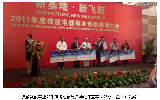 2011年4月14日(星期四),貝特電子科技有限公司應邀出席廣東美的集團舉行的2011年度微波電器事業供應商大會和新基地落成典禮,在此次盛會中,來自海內外的供應商和客戶參加了此次為期兩天的盛會,期間美的將從其900多家供應商中選出20名最佳供應商授予新年度“戰略供應商”大獎。新基地也進一步印證了美的的”5年再造一個美的”的宏偉戰略,這對我們全體供應商均是一個再上臺階的機會。