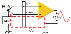 接地環路會嚴重影響測試結果,例如,在圖4所示的電路中,為了能夠長時間監測一個電機的溫度,在電機上連上一個熱電偶傳感器,由于電機箱是接地的,因此熱電偶也接地,而數據采集設備地與電機箱地之間存在電勢差,因此產生了電流。你可以注意到,加在測試信號的噪聲可能是交流的,或者一個簡單的直流偏移值,但最終無可避免地影響了測試精度。