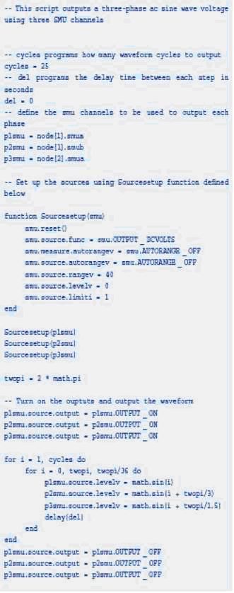這部分包含許多腳本例子說明吉時(shí)利支持腳本的儀器的一些特點(diǎn)。圖1示出了兩臺(tái)吉時(shí)利系統(tǒng)源表如何使用單腳本控制產(chǎn)生3相交流波形。在這個(gè)例子中,使用吉時(shí)利的TSP-Link技術(shù)連接這兩臺(tái)儀器,因而很容易用腳本控制這兩臺(tái)儀器。