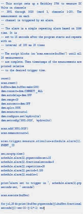 圖2說明了基于LXI Class B技術(shù)的定時(shí)器如何控制腳本工作。在此腳本中,吉時(shí)利3706型LXI Class B儀器使用基于IEEE 1588的計(jì)時(shí)器排列一系列測(cè)量的順序。LXI Class B的定時(shí)特點(diǎn)特別適合避免或最小化由延遲或通信時(shí)延導(dǎo)致的系統(tǒng)時(shí)延。