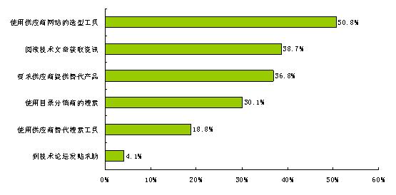 通過對替代方式的調查發現,不同品牌物料之間的替換成為2010年使用替代物料的最主要方式,而2009年的調查結果中廠商新老產品替換占據主流。替代方式側重點的變化也反映了供應鏈中物料品牌替換比較活躍,這為新的品牌供應商切入市場提供了機會。那么工程師如何獲得品牌替代信息呢?通過調查發現,使用在線工具是尋找物料品牌替代信息成為新寵。在線工具包括供應商網站的選型工具、目錄分銷商的搜索工具、供應商替代搜索工具。此外,技術文章也是影響工程師選擇的重要方式,而技術文章恰恰是國內元器件供應商的短板。