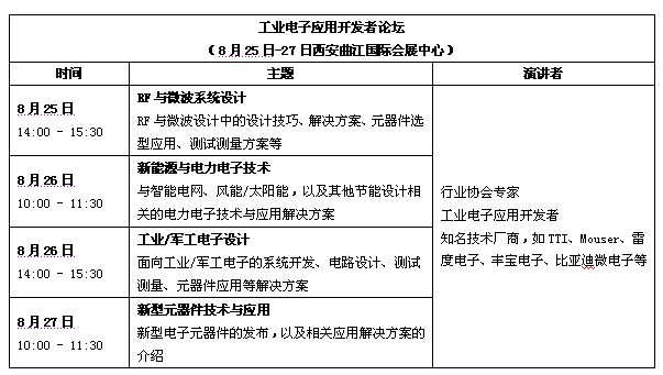 作為2011西部電子論壇中的一個(gè)新環(huán)節(jié),論壇組委會(huì)將聯(lián)合2011中國(guó)(西安)電子展,同期展會(huì)2號(hào)館推出工業(yè)電子應(yīng)用開(kāi)發(fā)者論壇,該活動(dòng)是2011中國(guó)(西安)電子展中的核心活動(dòng)之一,聚焦以西安為中心的電子行業(yè)最為關(guān)注的RF微波、新能源以及工業(yè)應(yīng)用等主題,邀請(qǐng)研發(fā)一線的工程師與領(lǐng)先的技術(shù)廠商代表同臺(tái)展示設(shè)計(jì)新技術(shù)、新思路、新方案,為工業(yè)電子應(yīng)用開(kāi)發(fā)者提供深入、平等交流的機(jī)會(huì)。