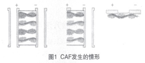 電子產(chǎn)品使用過程中性能是否穩(wěn)定涉及印制板的使用質(zhì)量。使用中常遇見印制板的缺陷有:離子遷移(CAF)和焊點(diǎn)質(zhì)量(Joint)等。銅離子遷移系透過玻纖紗束或紗束與樹脂之細(xì)縫,造成兩導(dǎo)體例如(孔壁到孔壁)間出現(xiàn)金屬銅的遷移,其產(chǎn)生機(jī)理是:印制板通電后由于電位差,高壓極(陽極)銅金屬在水氣中首先出現(xiàn)腐蝕而氧化成銅Cu2+,于是銅離子會沿著通道緩緩向另一端低壓極進(jìn)行遷移,同時(shí),低壓端也會往陽極移動(dòng),于是兩者在通道途中遭遇后即可還原出金屬銅,形成兩地間的連通即漏電短路,一旦出現(xiàn)短路,電阻頗高的發(fā)熱將CAF燒斷,爾后又開始新的CAF。這樣周而復(fù)始發(fā)生,造成電子產(chǎn)品功能時(shí)有時(shí)無。如下圖CAF發(fā)生的幾種情形。
