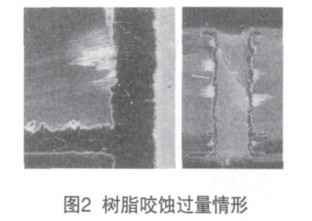 可見,產(chǎn)生CAF必須具備下列五種條件:裸露的銅導(dǎo)體、水氣、電解質(zhì)、電位差和通道。前四項(xiàng)在電子產(chǎn)品的使用中不可避免。通道是唯一可控制產(chǎn)生CAF的途徑,而通道的形成主要與印制板的生產(chǎn)過程中材料、鉆孔、去沾污等因素相關(guān)。一般地來說材料的玻纖越細(xì),樹脂含量越高,韌性越好,鉆孔撕裂的機(jī)率較低,因此,對于高密度的印制板或潮濕環(huán)境中使用的印制板盡可能采用細(xì)玻纖的材料。不同的材質(zhì)的鉆頭,不同鉆孔數(shù)量,不同的鉆孔參數(shù),鉆孔時(shí),鉆頭對增強(qiáng)材料的沖擊不同,孔壁質(zhì)量的差異較大,對孔壁的損傷也不盡一致,芯吸程度不一。因此,為了杜絕通道的發(fā)生,應(yīng)當(dāng)嚴(yán)格控制鉆孔質(zhì)量,確保孔壁光滑平整。去沾污主要目的是去除內(nèi)層導(dǎo)體鉆孔時(shí)吸附樹脂,當(dāng)然,也咬蝕孔壁絕緣層中的樹脂,有時(shí)為了形成負(fù)凹蝕,孔壁絕緣層樹脂甚至咬蝕更多。這時(shí),咬蝕量需嚴(yán)格控制。否則,極易形成“通道” 。如下圖樹脂咬蝕過量情形。