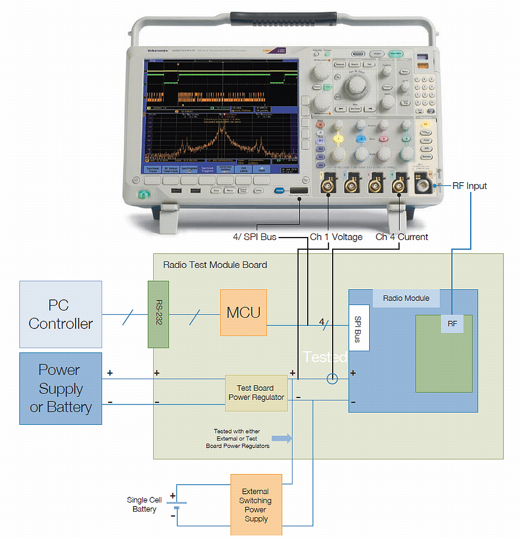 圖1.被測器件(Microchip Technologies MRF89XA 868 MHz無線電)與混合域示波器之間的測試連接。