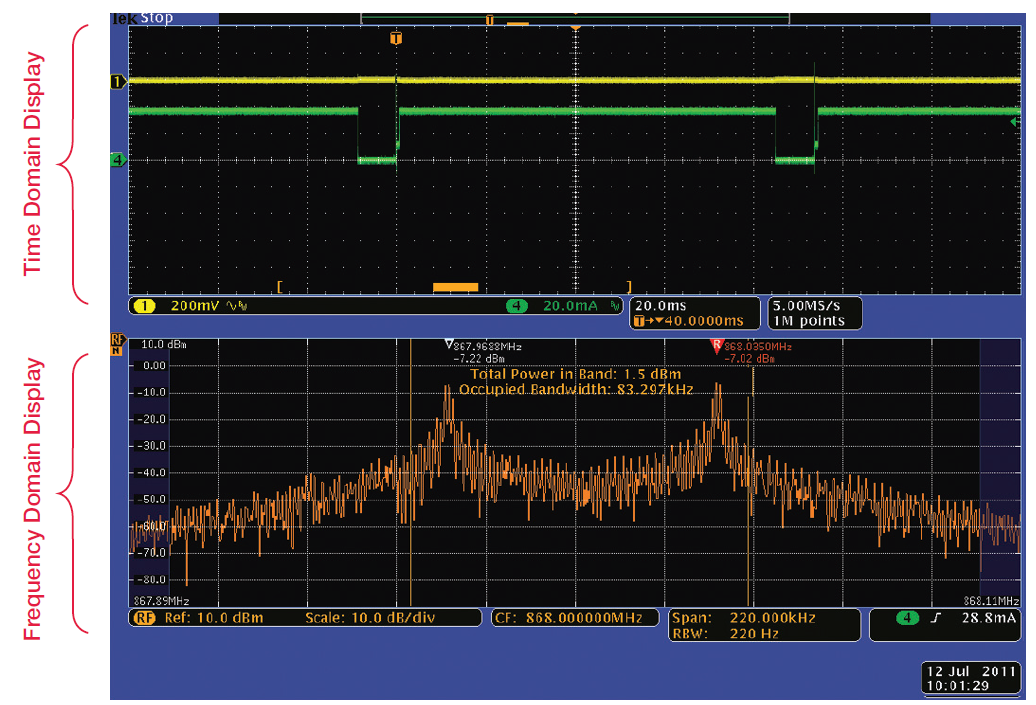 畫面的下半部分顯示了RF信號的頻域視圖,在本例中是無線電發射機輸出,畫面的上半部分是時域的傳統示波器視圖。頻域視圖中顯示的頻譜來自時域視圖中短橙色條指明的時間周期,稱為頻譜時間(Spectrum Time)。