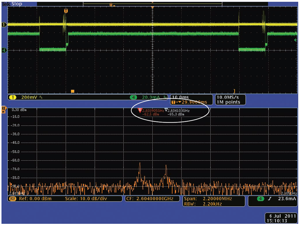 為簡便地看到無線電中的數據包傳輸,我們在時域視圖中增加了RF隨時間變化曲線。標有“A”的橙色曲線顯示了瞬時RF幅離隨時間變化。標有“f ”的橙色曲線顯示了相對于畫面中心頻率的瞬時RF頻率隨時間變化。綠色曲線(通道4)顯示了到模塊的電流??梢钥吹?,電流從數據包之間接近0上升到傳輸期間大約40 mA。黃色曲線(通道1)顯示了模塊電源電壓上的AC紋波。注意在傳輸期間只有很小的電壓暫降。