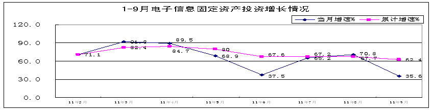 前三季度,電子信息產業500萬元以上項目完成固定資產投資6492億元,投資額超過去年全年水平近500億元,同比增長62.4%,增速高于工業投資35.9個百分點。其中9月份完成投資889.6億元,同比增長35.6%,增速比8月下降35.2個百分點,這是今年以來第二個月月度投資增速低于60%。
