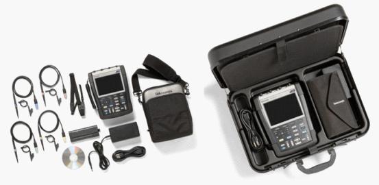手持示波器經常用于進行電機驅動器、功率變換器/逆變器和功率半導體器件的功率測量。通過結合使用泰克的廣泛電壓和電流探頭,THS3000系列手持示波器可進行這些測量。其四個輸入通道中的每個通道均可進行配置,以匹配探頭類型和衰減系數,確保正確的測量和光標讀數。該產品標配4個新型的 300 MHz CAT III 安全等級探頭,也標配了OpenChoice軟件,像以前使用泰克臺式示波器一樣方便。圖4中左圖為THS3000系列標準機型配件,包括 4 個探頭、電池、電源適配器和電源線、OpenChoice CD、校準證書、系帶和軟提箱。圖4中右圖為TK 機型配件,包括4 個探頭、電池、電池適配器和電源線、 OpenChoice CD、校準證書、系帶、探頭配件包、探頭盒和硬提箱。