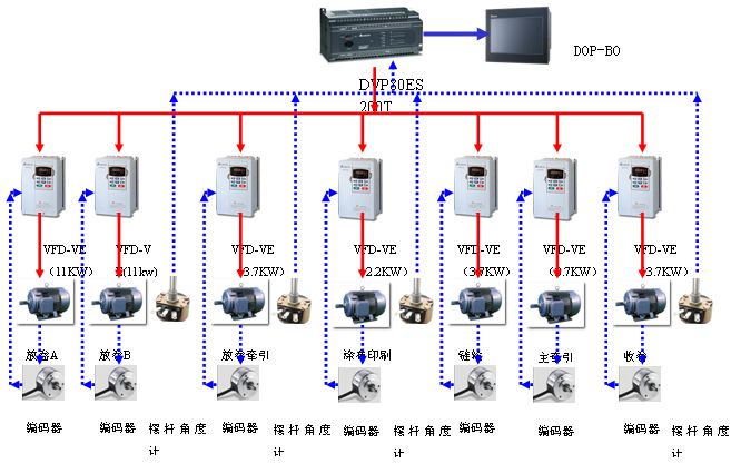 系統中所有變頻傳動軸均采用了編碼器反饋的閉環的矢量控制模式,之所以使用閉環矢量控制模式,是為了保證傳動軸的速度控制精度能夠更準確、更快速、更穩定,盡量避免電機的滑差所造成的不同速度的線速度線形關系。