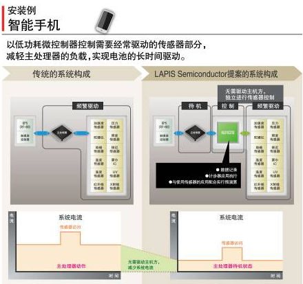 羅姆集團旗下的LAPIS Semiconductor面向智能手機市場開發(fā)出了可用更低耗電量綜合控制各種傳感器的、世界最小級別的低功耗微控制器“ML610Q792”。最近,在手機中智能手機所占的比率日益增加,而為了提供新的應(yīng)用和服務(wù)不斷增加的傳感器群,導致智能手機的電池負載持續(xù)上升。LAPIS Semiconductor著眼于這種情況,將需要頻繁驅(qū)動的傳感器群從主處理器分離,通過低功耗微控制器進行控制,減輕了主處理器的負載,從而實現(xiàn)了電池的長時間驅(qū)動。另外,利用本微控制器的特點——即耗電量低的特性,通過與無線通信的組合,亦適用于傳感器網(wǎng)絡(luò)模塊等應(yīng)用。
