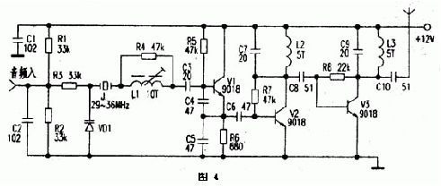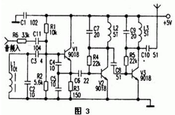 圖4為晶振式發(fā)射機電路。電路中J.、VD1、L1、C3~C5、V1組成晶體振蕩電路。由于石英晶體J的頻率穩(wěn)定性好,受溫度影響也較小,所以廣泛用于無繩電話及AV調(diào)制器中。Vl是29~36MHz晶體振蕩三極管,發(fā)射極輸出含有豐富的諧波成分,經(jīng)V2放大后,在集電極由C7、L2構(gòu)成諧振于88-108MHz的網(wǎng)絡(luò)選出3倍頻信號(即87~108MHz的信號最強),再經(jīng)V3放大;L3、C9選頻后得到較理想的調(diào)頻頻段信號。頻率調(diào)制的過程是這樣的,音頻電壓的變化引起VD1極間電容的變化;由于VD1與晶體J串聯(lián),晶體的振藩頻率也發(fā)生微小的變化,經(jīng)三倍頻后,頻偏是29-36MHz晶體頻偏的3倍。實際應(yīng)用時,為獲得合適的調(diào)制度,可選擇調(diào)制頻偏較大的石英晶體或陶瓷振子,也可以采用電路稍復(fù)雜的6-12倍頻電路。若輸入的音頻信號較弱;可加上一級電壓放大電路。