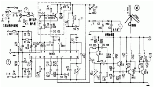 很多調(diào)頻立體聲模塊均將BAl404和外圍元件封裝在一個塑料或金屬外殼內(nèi)制成,只露出電源輸入、音頻輸入、射頻輸出引線,只要了解BAl404以后,就知道調(diào)頻立體聲模塊內(nèi)部是怎么一回事了。來自音源的立體聲音頻信號經(jīng)R1、R2、R5、C1、C3、C5(R4、R3、R6、C2、C4、C6)組成的網(wǎng)絡(luò)耦合到BAl404。經(jīng)IC內(nèi)部左(右)聲道放大,再進行平衡調(diào)制,調(diào)制后的復(fù)合信號從IC的第14腳輸出,后與第13腳上的導(dǎo)頻信號通過B9、C15,B10、C16、C17構(gòu)成的網(wǎng)絡(luò)進行混頻,混頻后的復(fù)合信號進入IC的12腳,對比的⑧、⑨、⑩腳,C20--C22及髓組成的電容三點式振蕩器進行調(diào)頻,IC的⑩腳上已調(diào)制的射頻信號經(jīng)內(nèi)部放大后從第⑦腳輸出,經(jīng)C18、L2選頻后送至天線TXl。要實現(xiàn)調(diào)頻立體聲,BAl404的⑤、⑥腳需外接38kHz晶體,但業(yè)余制作時的確很難購得38kHz的專用晶體,所以在無該晶體的情況下,可以參考虛線內(nèi)的電路,用分立元件制作一個38kHz振蕩器,該38kHz信號經(jīng)過R8、C10送人IC第⑤腳。制作時,Ll可用收音機中頻變壓器ITF—2—1、TTF-2-2或TFF-2-9等,同時注意引腳的連接不要搞錯,③腳接地,②腳接V1的發(fā)射極,①腳為反饋和輸出腳。通過調(diào)整其磁芯可以獲得頻率較穩(wěn)定、幅度足夠高的38kHz信號。