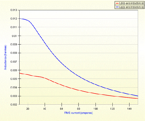 內嵌磁鋼式永磁電機的調速范圍寬是由于其具有較高的凸極比(d軸電感與q軸電感之比)。MotorSolve能準確地描述由磁路飽和引起的電感的非線性規律。上圖表明了Ld 和Lq是電流的函數。[page]