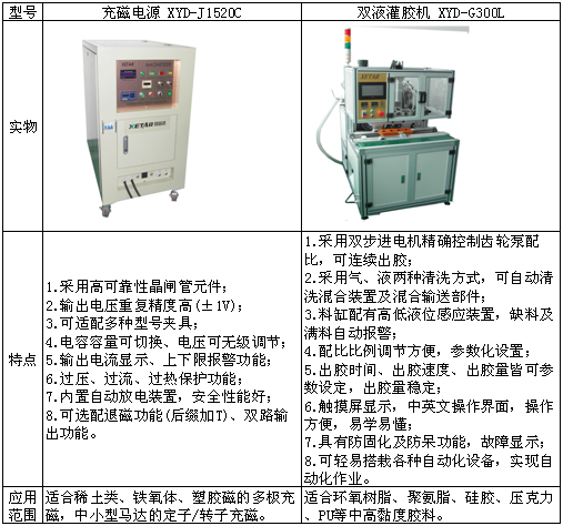 深圳市欣音達科技有限公司是一家專業研發生產流體控制系統及磁性應用系統的制造企業,下轄有灌膠機事業部、點膠機事業部及充退磁機事業部,客戶來自全球各地。中國電子展期間,欣音達科技給我們帶來了兩款先進的產品,其特點如下表所示: