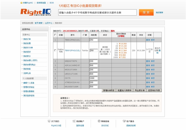 圖1:RightIC網(wǎng)站BOM單批量查詢功能的詢價(jià)頁面。