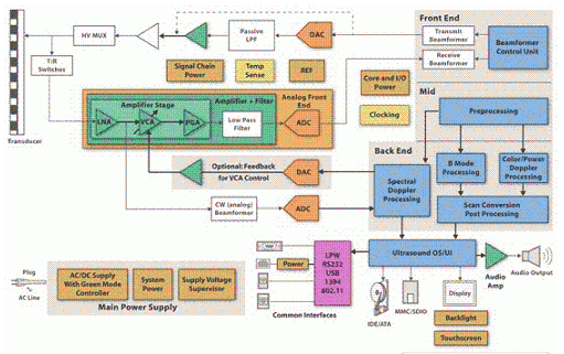 設計超聲波系統是一項復雜的工作,且 AFE 的每一種特性都能影響到整個系統的性能。針對每一種系統類別平衡各種參數的能力無疑是一種藝術。就便攜式超聲波系統而言,功耗是一個至關重要的考慮因素。低功耗就是說利用有限的電池電源可獲得更長的工作時間。雖然這些性能的降低通常是在便攜式(低端)系統可接受的范圍內,但是其會影響到其他參數,如:輸入信號范圍、輸入等效噪聲、諧波失真等。