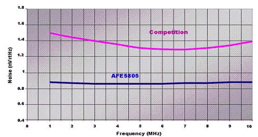 除了功耗以外,AFE 噪聲是超聲波系統設計人員需要考慮的第二個問題。來自超聲波變送器接收信號的振幅可能會為介于 10uVPP 到 1VPP [1] 不等。能夠被探測到的信號越小,系統的靈敏度就越高。輸入等效電流和輸入等效電壓噪聲都會影響系統靈敏度。通常,我們為高端到低端的系統選擇 0.7 nV/rt(Hz)~1.5 nV/rt(Hz) (RTI)的噪聲參數。經在現實系統中證實,這些噪聲參數足以產生高質量的圖像。