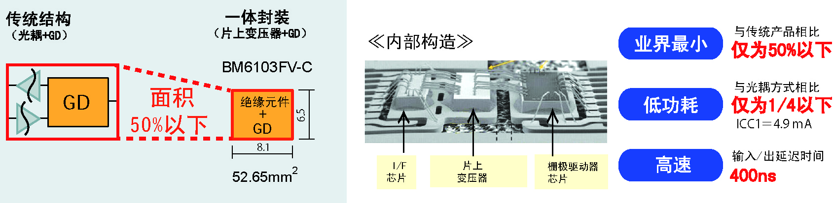 此次羅姆采用獨(dú)創(chuàng)的微細(xì)加工技術(shù),開發(fā)出片上變壓器工藝,進(jìn)而成功開發(fā)出小型并且內(nèi)置了絕緣元件的柵極驅(qū)動(dòng)器。無需外置零件,同時(shí)通過采用小型封裝,與傳統(tǒng)產(chǎn)品相比,安裝面積減少了約50%。不僅如此,由于內(nèi)置車載逆變器電路所需的全部保護(hù)功能,不僅有助于實(shí)現(xiàn)逆變器的小型化,還非常有助于減輕設(shè)計(jì)負(fù)擔(dān)。
