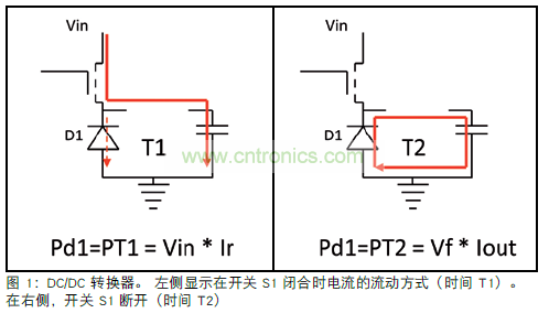在 T1 期間,D1 處于關斷狀態;唯一流過的電流是反向電流 (Ir)。 此電流相對較低,而且主要由輸入電壓(Vin) 決定。 二極管 (PT1)的功率損耗粗略可用下式計算:Ir*Vin。