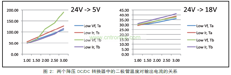 圖 2 還清楚地顯示輸入輸出電壓比。左圖顯示低占空比5 V輸出的D C / D C 轉換器。在較低的占空比時,T2的時間較長,功耗也較高。這反過來使二極管更熱,使得Ir增加地更大,因此PT1變得更高。總的結果是:在輸出電流增加時,二極管的溫度會很快地升高。在電流較高時,溫度實際上已經超過了二極管規定的工作范圍。在圖 2 的右側,較高的輸出電壓18V時,它的占空比也比較高,這使得PT2損耗保持在可控制范圍內。二極管上產生的熱量較少,使得Ir增加的幅度較小,因此,PT1會更少,并且整體溫度升高幅度較小。