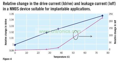 圖4:NMOS設備中漏電流與驅動電流隨溫度變化