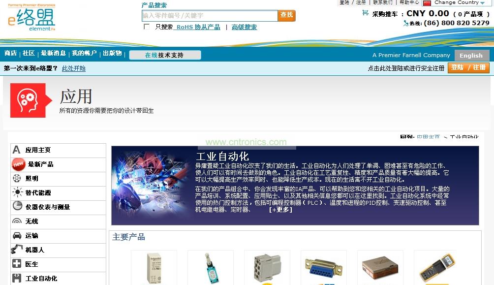 工業自動化可處理諸多生產中重復、人工難以完成、甚至是危險的工作,節省出的人員可承擔其它工作。制造廠家如浩亭(Harting)、霍尼韋爾,莫仕(Molex)、施耐德和TE Connectivity的控制解決方案在e絡盟子站中均可找到,包括可編程控制(PLC)、溫度和工藝PID控制,可變速驅動控制、甚至還包括機電繼電器、計時器和計數器控制。