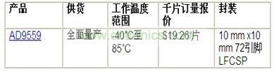 AD9559轉換器IC可將任何標準輸入頻率同步轉換為高達1.25 GHz 的任何標準輸出頻率,12 kHz至20 MHz集成帶寬范圍內的總抖動小于 400 fs RMS(均方根)。AD9559用單芯片IC取代了兩個同步時序器件,有助于設計人員減小電路板面積及優化成本。