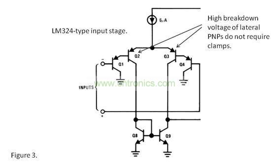 使用橫向PNP 輸入晶體管的通用運算放大器一般沒有輸入鉗位,例如:LM324" target="_blank" title="Link to Product Folder">LM324、LM358" target="_blank" title="Link to Product Folder">LM358、OPA234" target="_blank" title="Link to Product Folder">OPA234、OPA2251" target="_blank" title="Link to Product Folder">OPA2251 和OPA244" target="_blank" title="Link to Product Folder">OPA244。這些運算放大器一般為“單電源”類型,其意味著它們擁有一個擴(kuò)展至負(fù)電源端(或者稍低)的共模范圍。輸入偏置電流為一個負(fù)數(shù)時,表示輸入偏置電流自輸入引腳流出。這時,我們通常可以認(rèn)定它們?yōu)檫@類運算放大器。但是,需要注意的是,使用PNP 輸入的高速運算放大器一般有輸入鉗位,而這些PNP 是一些具有更低擊穿電壓的垂直PNP。
