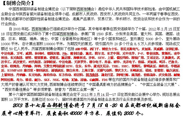 地 點(diǎn): 西安曲江國際會(huì)展中心 時(shí) 間:第16屆2013年3月14-17日