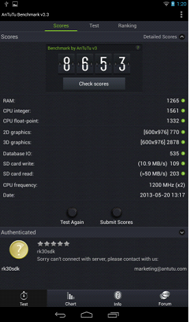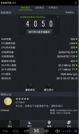 AnTuTu Benchmark是一個專門給Android設備的手機、平板電腦硬體打分的軟件,,通過“內存性能”、“CPU整數性能”,“CPU浮點性能”、“2D、3D繪圖性能”、“數據庫IO”、“SD卡讀、寫速度” 等性能測試對手機的硬體性能做出評分。