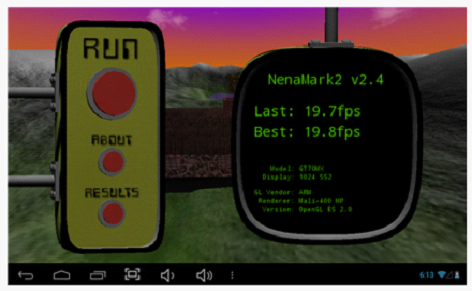 NenaMark2是一款用于Android設備的硬件加速基準測試程序,通過演示一款實時渲染的畫面來對手機的圖形能力進行測試,包括反射、動態陰影、曲面參數、復雜光線模式等內容,需要Android 2.0以上系統和OpenGL ES 2.0支持。