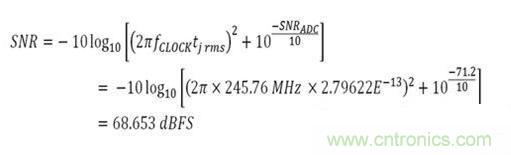 現(xiàn)在,通過計(jì)算得到了所有必須的要素,但依然缺少最后一個(gè)公式。 需要計(jì)算此抖動(dòng)對AD9643的SNR產(chǎn)生的影響。 現(xiàn)在來看看這個(gè)公式是什么,然后代入已知數(shù)。已知時(shí)鐘頻率和rms抖動(dòng)。 從AD9643數(shù)據(jù)手冊中可以得到140 MHz模擬輸入頻率下的SNR等于71.4 dBFS。 使用公式,可以看到結(jié)果為: