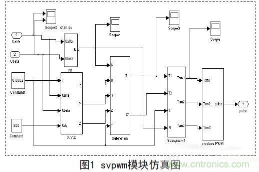 PlD控制有很強的生命力,它對于大多數過程都具有良好的控制效果和魯棒性,而且算法原理簡明,參數物理意義明確,理論分析體系完整且應用經驗豐富。因此針對系統中的抑制干擾特性這一方面的要求可以采用PID控制器。對單電機的控制采用雙閉環設計,通過svpwm進行調速,使系統具有良好的穩定性,svpwm調速模塊仿真圖如圖1所示。然后將兩臺電機反饋回來的轉速差作差,再通過PID調節作為當負載有變化時的轉速反饋額外補償。系統仿真模型如圖2所示。