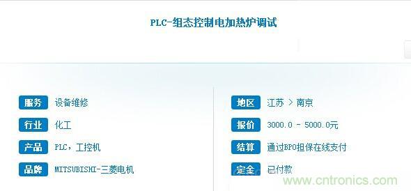 該項目由電加熱爐設備制造商發起,為該企業某型號的電加熱爐提供電氣控制開發,具體由PLC作為控制主體,結合工藝需求完成編程和組態設計,后期完成儀表接線和調試工作,工作周期30天。該活兒經過3天發布后,接到17名工程師的投標方案,最終由周邊某市的一名gongkongBPO工程師承接完成。