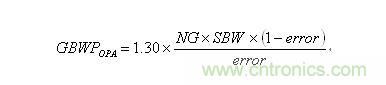 就該電路而言,如果您想要容許放大器 0.05 的增益誤差,同時您知道因產品和溫度的不同,放大器的 GBWP 會改變 30% 最大值,則您需要一個具有 247 MHz GBWP 的放大器。產品選擇部分的指導公式如下: