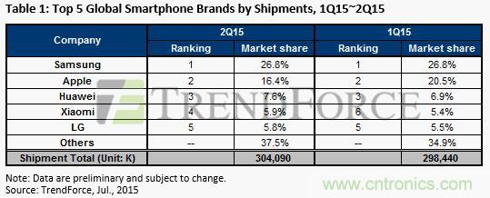 【導(dǎo)讀】近日,市場研究機構(gòu)TrendForce發(fā)布2015年度第二季度全球智能手機報告。中國的華為明顯獨領(lǐng)風(fēng)騷。數(shù)據(jù)顯示,三星雖然從蘋果手里奪回第一的寶座,但是,Q1和Q2 幾乎毫無變化。蘋果的市場份額則一調(diào)再掉,從Q1的20.5%掉到Q2的15.4%。華為的市場份額增加了7%,小米的份額增加了5%。